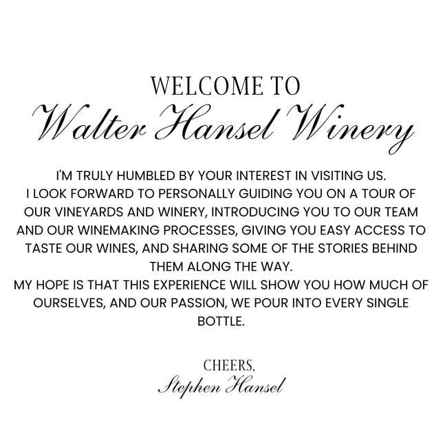 We look forward to welcoming you to Walter Hansel Winery! We’ll be in touch shortly to arrange the details of your tasting.